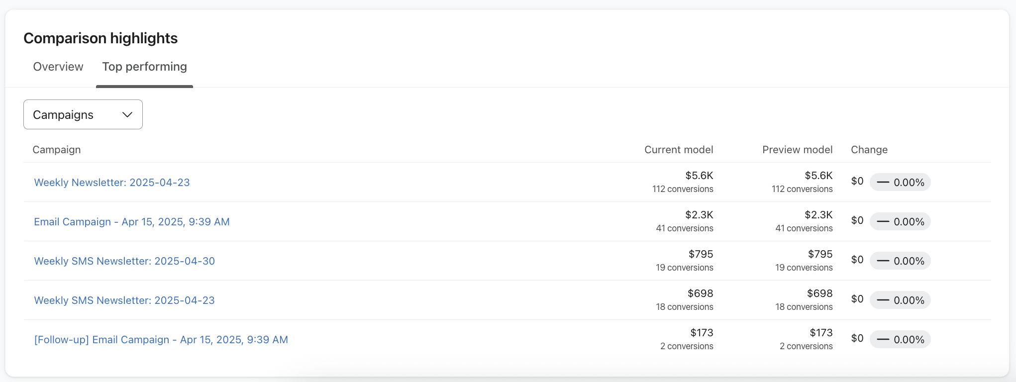 En la pestaña Rendimiento superior, haz clic en el menú desplegable Campañas para alternar entre tus campañas enviadas con mejor rendimiento (correo electrónico, SMS o push) o flujo y cómo cambia el rendimiento en función de tu configuración. En la última columna, verás un cambio porcentual que indica cómo estos ajustes han modificado tu seguimiento por campaña o flujo.