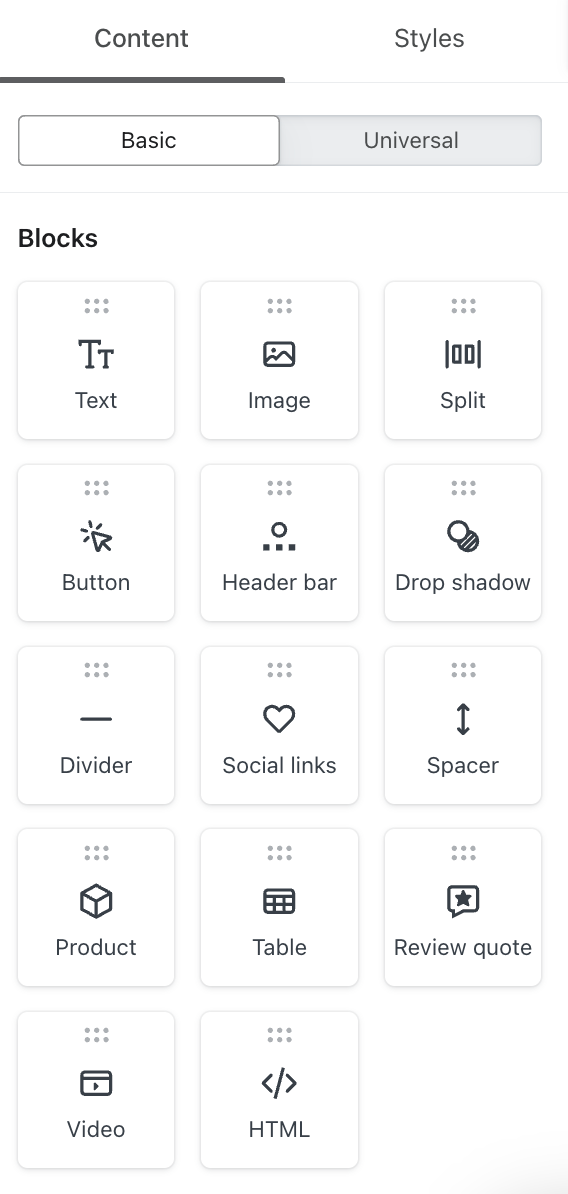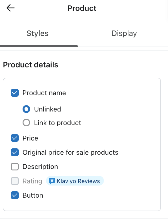 En la pestaña Estilos, también puedes elegir mostrar la valoración media y la cantidad de valoraciones que ha recibido un producto. Esto requiere que actives Klaviyo Reviews. Aprende a mostrar valoraciones de productos en correo electrónico con un bloque de productos.