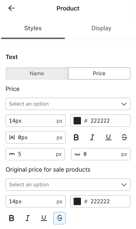 En la pestaña Estilos de un bloque de producto, marca la opción Precio original de los productos en venta para mostrar el precio original tachado junto al precio de venta.