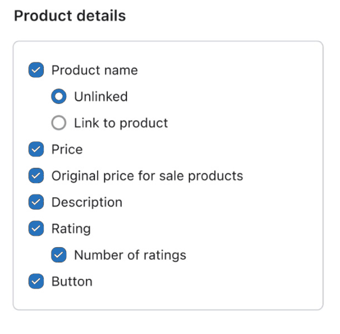 Para ajustar la apariencia de un bloque de producto, dirígete a la pestaña Estilos de ese bloque. Aquí puedes elegir qué detalles del producto aparecen (por ejemplo, el nombre del producto, el precio, el precio original para los productos en venta, etc.) y cómo se les da estilo, incluyendo el estilo de fuente, el tamaño y el color.