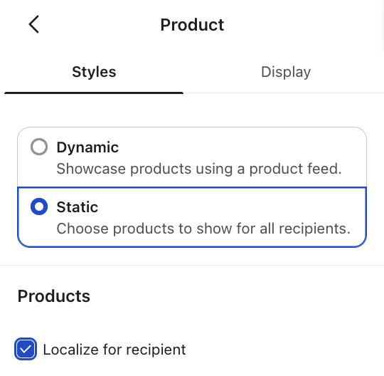 Si utilizas catálogos con reconocimiento de configuración regional y Shopify Markets habilitado, aparecerá una casilla de verificación Localizar para el destinatario en la configuración del bloque de productos estáticos.