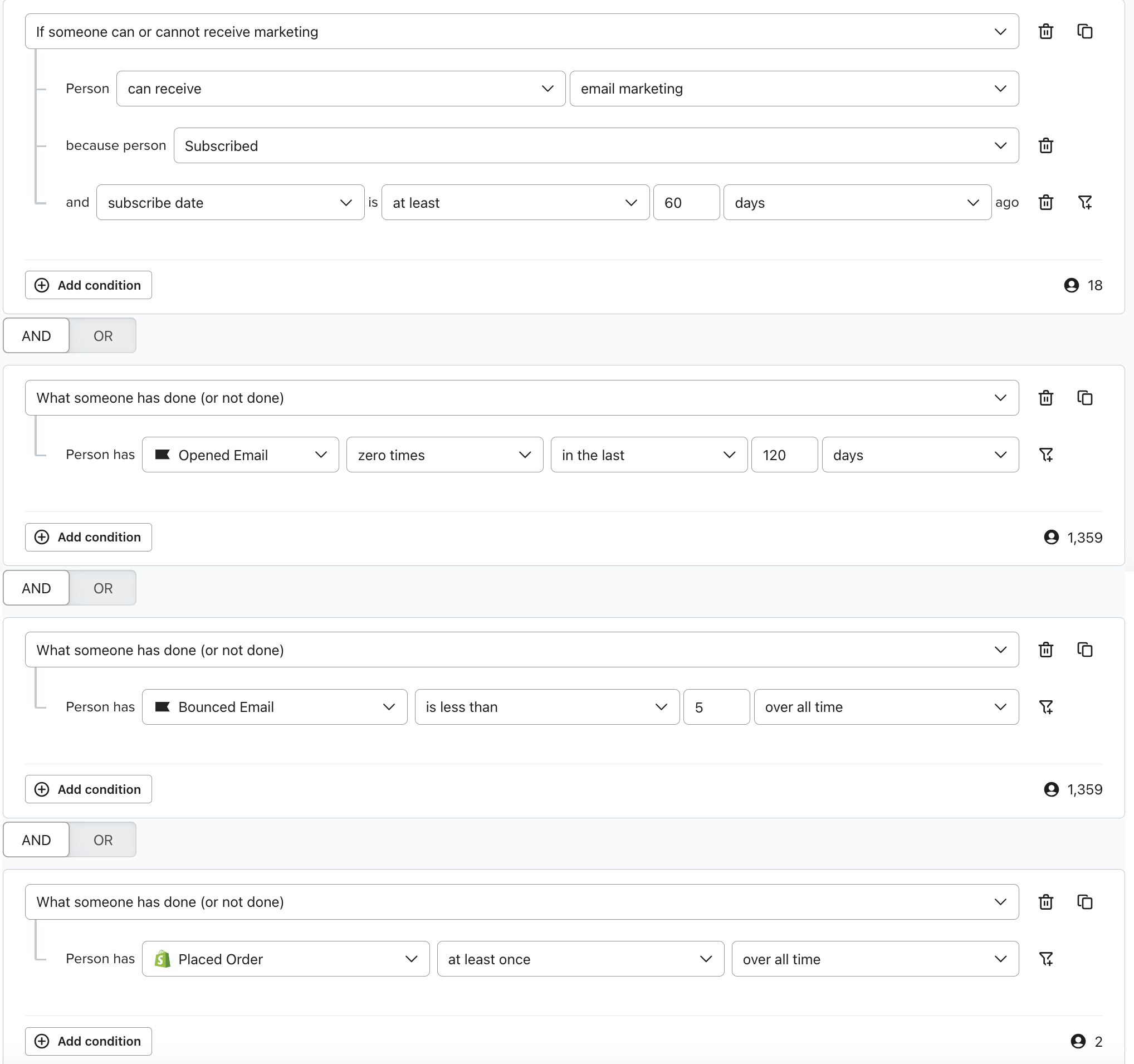 También puedes suprimir a quien no responda a estos correos electrónicos. Puedes hacerlo creando y exportando un segmento de los que recibieron cualquiera de los dos correos electrónicos pero no los abrieron (ver más abajo). Una vez que hayas exportado el segmento, navega hasta Audiencia > perfil > Ver perfil suprimido > importar para suprimir estos perfiles de la recepción de futuros correos electrónicos.