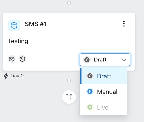 El flujo en Klaviyo no tiene interruptor de encendido/apagado. Cada mensaje individual de un flujo tiene su propio estado de envío: borrador, manual o en directo. Esto te permite construir una serie de flujos y habilitar ciertos mensajes para que empiecen a enviarse mientras aún finalizas otros mensajes que quieras habilitar más adelante.