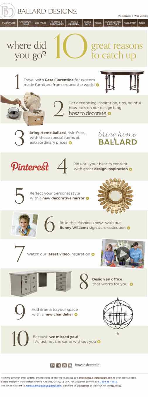 Este correo electrónico también puede ser más largo que el primero, dándote la oportunidad de dar más detalles. Haz que tú y el correo electrónico sean lo más atractivos posible. Para captar la atención del lector, puedes mostrar una imagen de tus empleados para que la empresa parezca más humana y tu mensaje más personal. Otra opción es diseñar el correo electrónico para que muestre tu información de forma fácil de leer y visualmente interesante. Este correo electrónico de Ballard Designs muestra un ejemplo.
