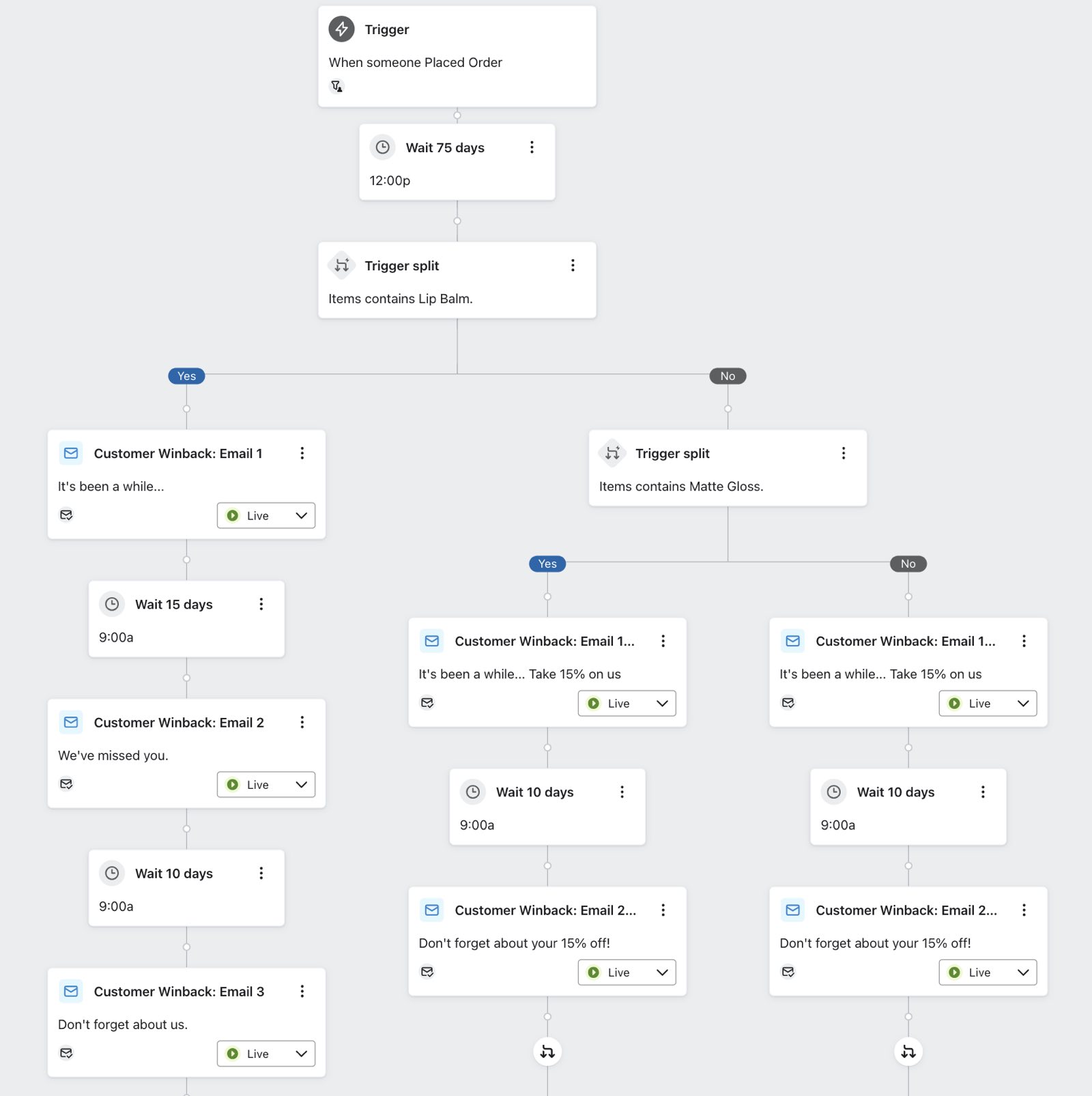Otra opción es dividir tu flujo o crear flujos separados para distintas categorías de productos, como en el ejemplo siguiente. Si alguno de tus artículos es reponible con un ciclo de compra establecido, quizá quieras excluirlo de tu flujo de recuperación y crear en su lugar un flujo de reposición independiente para él.