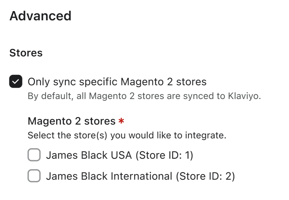 Si estás interesado en crear Klaviyo cuenta separada para cada una de tus Magento 2 tienda, comercio, haz clic en la opción avanzada de la página Magento 2 integraciones para recuperar una lista de tus tienda, comercio, y selecciona la tienda, comercio que quieres sincronizar con la Klaviyo cuenta con la que estás trabajando. -