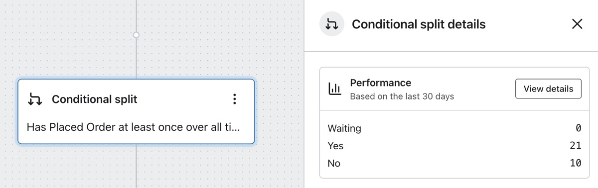 Por ejemplo, para una serie de bienvenida, puedes utilizar una división condicional para bifurcar tu flujo en función de si un suscriptor ya es cliente o no. Puede que quieras personalizar tu contenido para los nuevos suscriptores que quieres convertir en compradores por primera vez frente a los que ya te han comprado en el pasado.