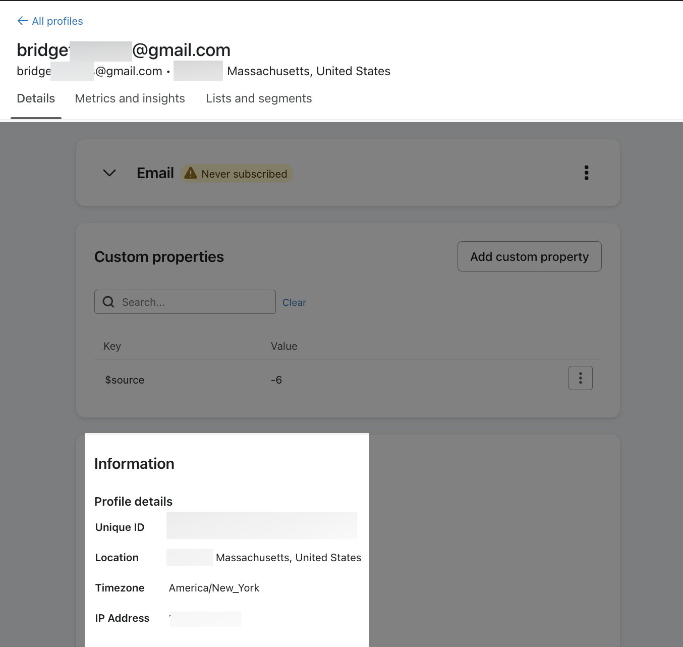 - Un perfil abre un correo electrónico (pero nunca ha comprado): Klaviyo utiliza la geolocalización por IP para actualizar la zona horaria y la ubicación.