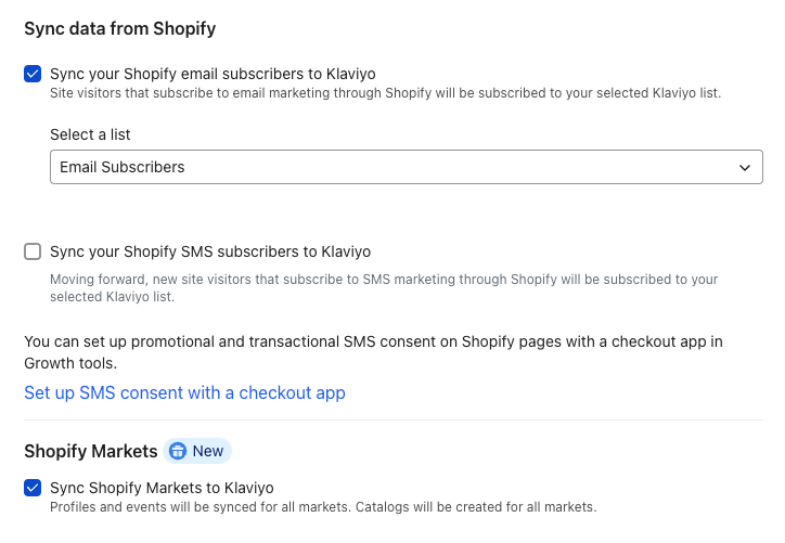 - Marca la casilla Sincronizar tus suscriptores de SMS de Shopify con Klaviyo para añadir automáticamente todos los futuros clientes que acepten recibir marketing por SMS en Shopify (ya sea en la página de pago o en formularios de registro de Shopify) a la lista que selecciones en el menú desplegable. También puedes configurar los SMS y editar esta configuración más tarde. Ten en cuenta que el consentimiento solo se sincronizará con Klaviyo si la persona se suscribe a SMS en Shopify por primera vez. Para añadir suscriptores de SMS históricos, sigue los pasos descritos en Cómo añadir suscriptores de SMS históricos de Shopify a tu lista.