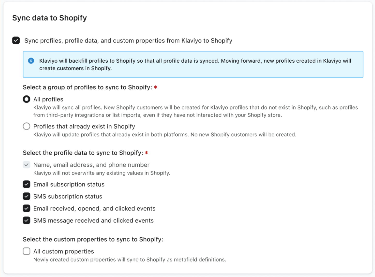 Si eliges todos los perfiles, Klaviyo creará nuevos clientes en Shopify para todos los perfiles (existentes y nuevos) creados en Klaviyo. Esto incluye perfiles sincronizados desde otras integraciones de terceros o añadidos a través de importaciones de listas, incluso si no han interactuado con tu tienda de Shopify. - Elige qué datos del perfil deseas sincronizar: nombre, dirección de correo electrónico, número de teléfono, estado de suscripción a correo electrónico, estado de suscripción a SMS (si los SMS están habilitados), eventos de correo electrónico, eventos de SMS y propiedades personalizadas del perfil. Si aún no tienes ninguna propiedad personalizada en tu cuenta de Klaviyo, verás una opción para sincronizar todas las propiedades. Si ya tienes propiedades del perfil personalizadas en tu cuenta de Klaviyo, puedes configurar qué propiedades deseas sincronizar.