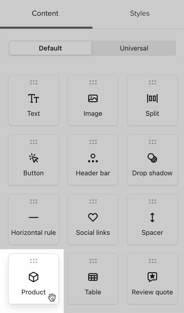 Los bloques de productos sólo son compatibles con los editores de arrastrar y soltar e híbridos de correo electrónico de Klaviyo. Para añadir un bloque de producto a un correo electrónico HTML personalizado, crea un correo electrónico híbrido.