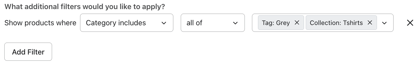 Los filtros se aplican a la variante, pero el bloque de productos renderiza los elementos. Si la suma del inventario de todas las variantes de un producto supera el umbral del filtro, es apto para mostrarse dentro de un bloque de productos. Los artículos tienen imágenes y precios por defecto, por lo que es posible que un artículo muestre una imagen y un precio de una variante que no coincidan exactamente con el precio o el filtro de inventario.