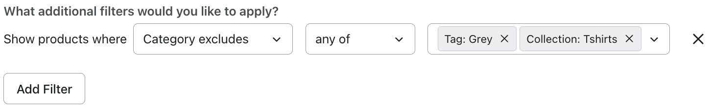 En las exclusiones y en cualquiera de los ejemplos siguientes, si un artículo es una camiseta o gris, se excluirá. Por ejemplo, se excluirían tanto los pantalones grises como las camisetas rojas, pero se incluirían los pantalones rojos. - Puedes filtrar en función del nivel de existencias y establecer un mínimo y un máximo. Tanto para el nivel de existencias como para el precio , puedes dejar en blanco el mínimo o el máximo (indicando un mínimo de 0 o ningún máximo, respectivamente), pero debes establecer el mínimo o el máximo.