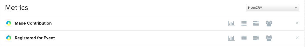 - Haz clic en la métrica Contribución realizada para comprobar que hay datos rellenados para esta métrica; ten en cuenta que la sincronización inicial de NeonCRM integraciones puede tardar hasta un par de horas, dependiendo de la cantidad de datos que tengas en tu cuenta.