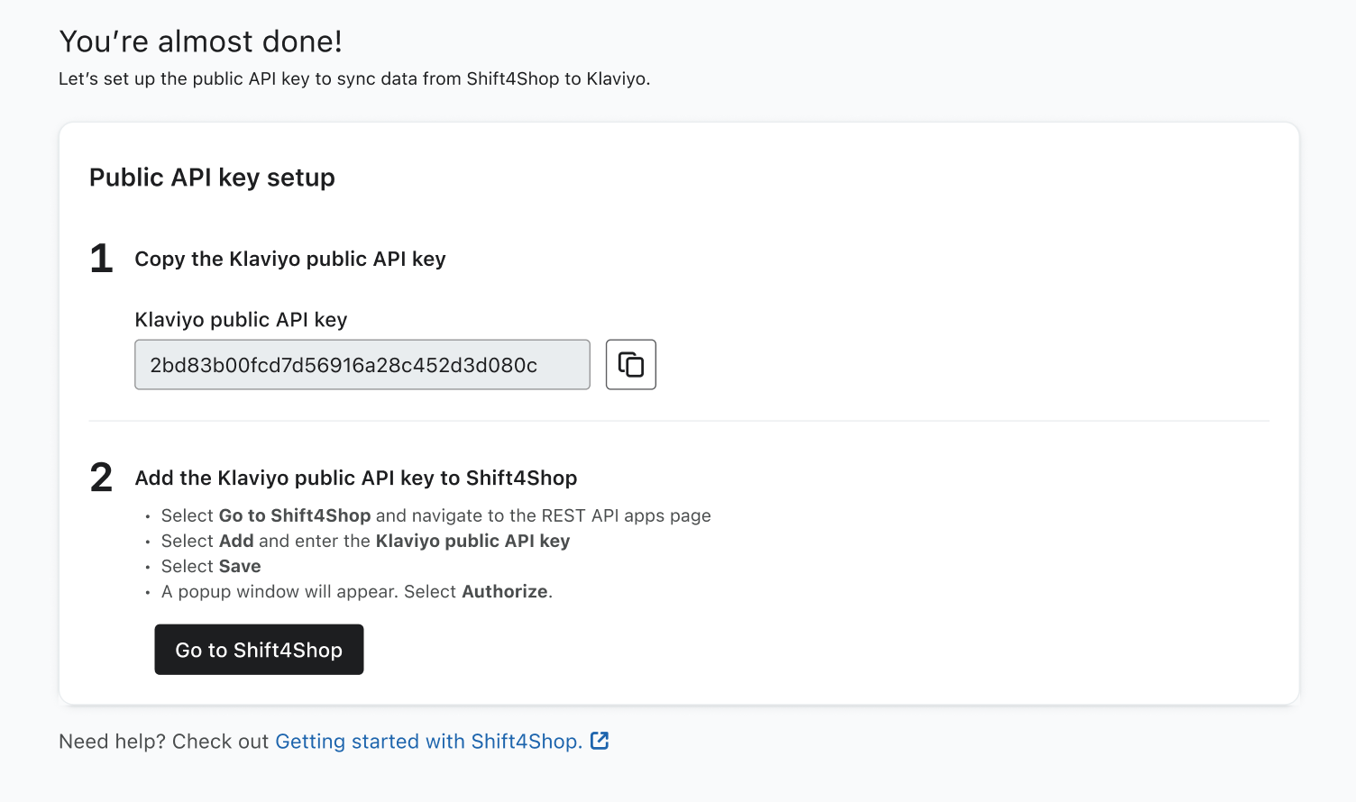 - Copia el Klaviyo Public clave de API que aparece en la página siguiente.