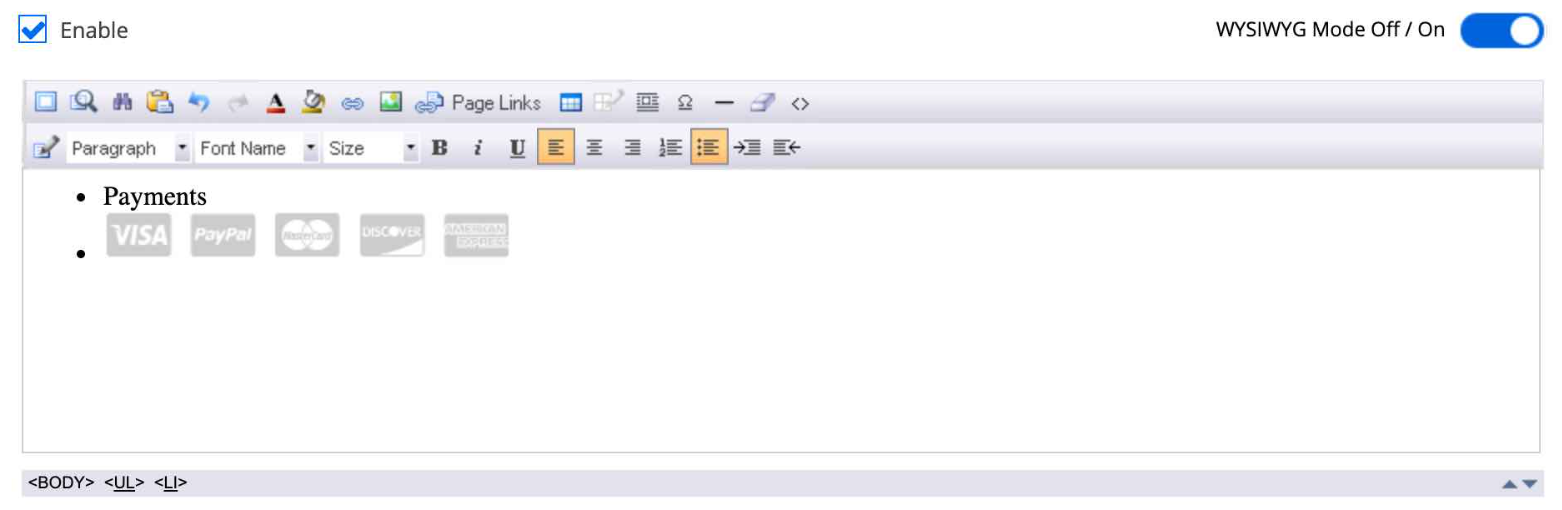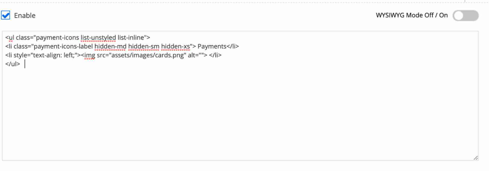 - Haz clic en el control deslizante situado junto a Modo WYSIWYG Apagado / Encendido para cambiar la vista al editor HTML.