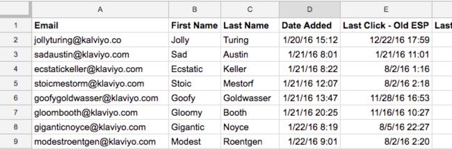 • Si utilizas una propiedad Klaviyo, utiliza el nombre de la propiedad Klaviyo como cabecera de la columna.