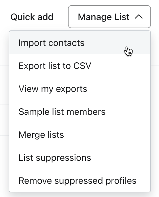 1. Si no aparece el botón Añadir rápidamente, significa que o bien no tienes los permisos de usuario correctos para subir contactos, o bien se trata de un segmento, no de una lista.