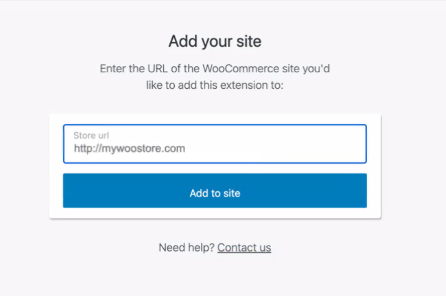 - Si tu WooCommerce portal de ecommerce cuenta no está conectado a tu sitio WooCommerce, copia y pega la URL de tu tienda, comercio en la casilla. Si ya está conectado, selecciona tu sitio en el desplegable. A continuación, haz clic en Añadir al sitio.