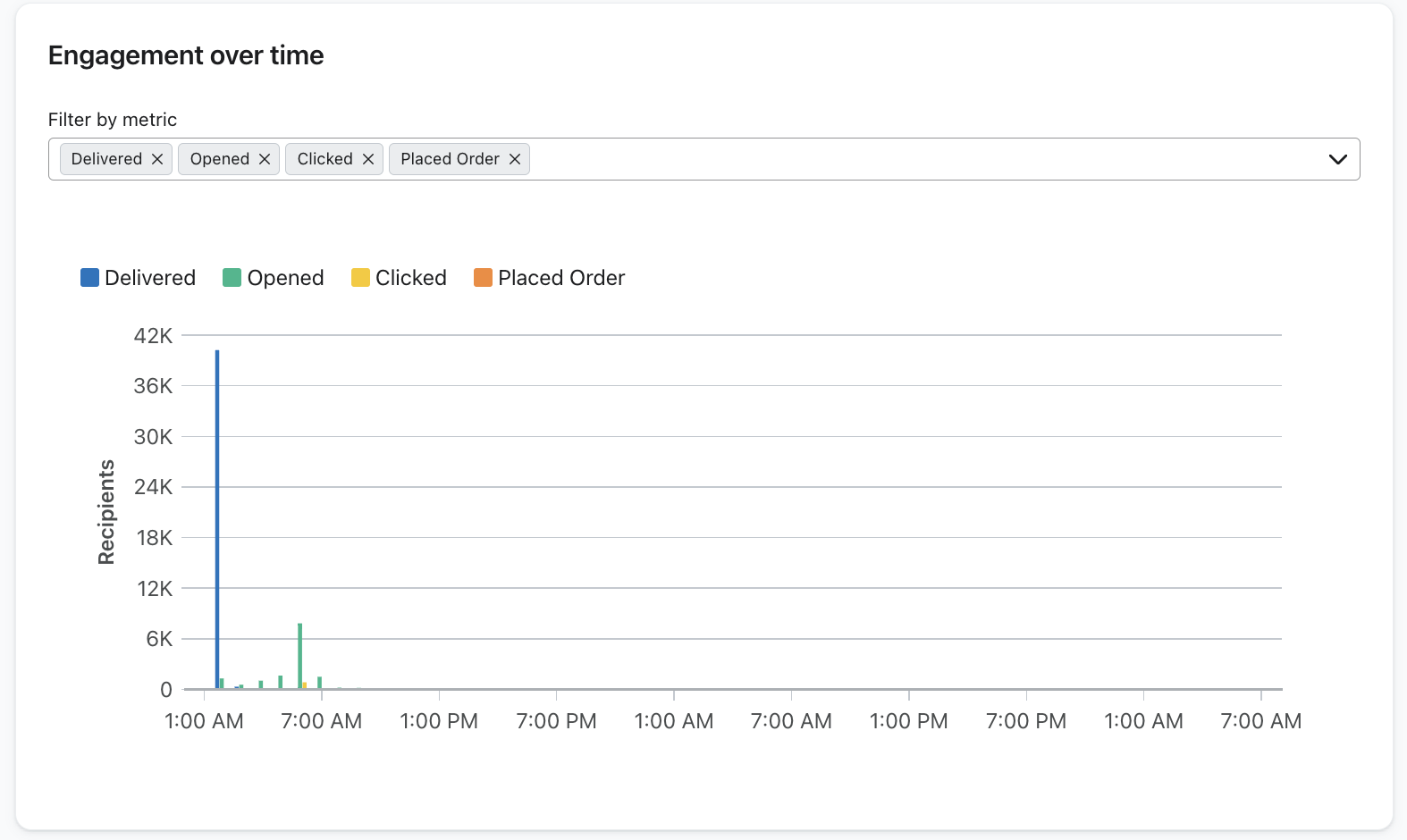 En la pestaña de visión general, la tarjeta de interacción en el tiempo proporciona datos clave relacionados con tu campaña desde que fue enviada. Además de la conversión métrica elegida, puedes revisar el número de entregas, aperturas y clics visualizados como gráficos de barras a lo largo del tiempo. Pasa el ratón por encima de cualquiera de estas barras para ver la métrica de ese momento.