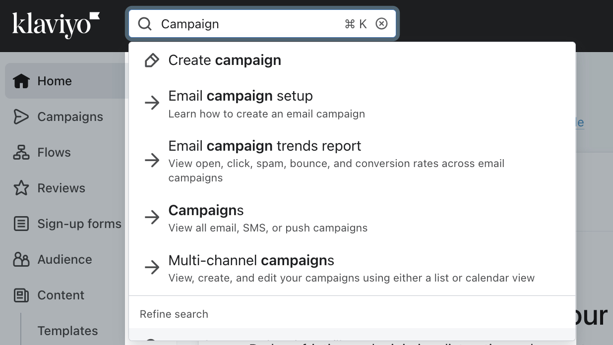 Para utilizar la función de búsqueda, sólo tienes que seleccionar la barra de búsqueda en Klaviyo y empezar a escribir tu consulta. Inmediatamente, Klaviyo empezará a sugerirte las acciones, páginas, secciones o búsquedas relacionadas más relevantes en función de lo que hayas introducido.