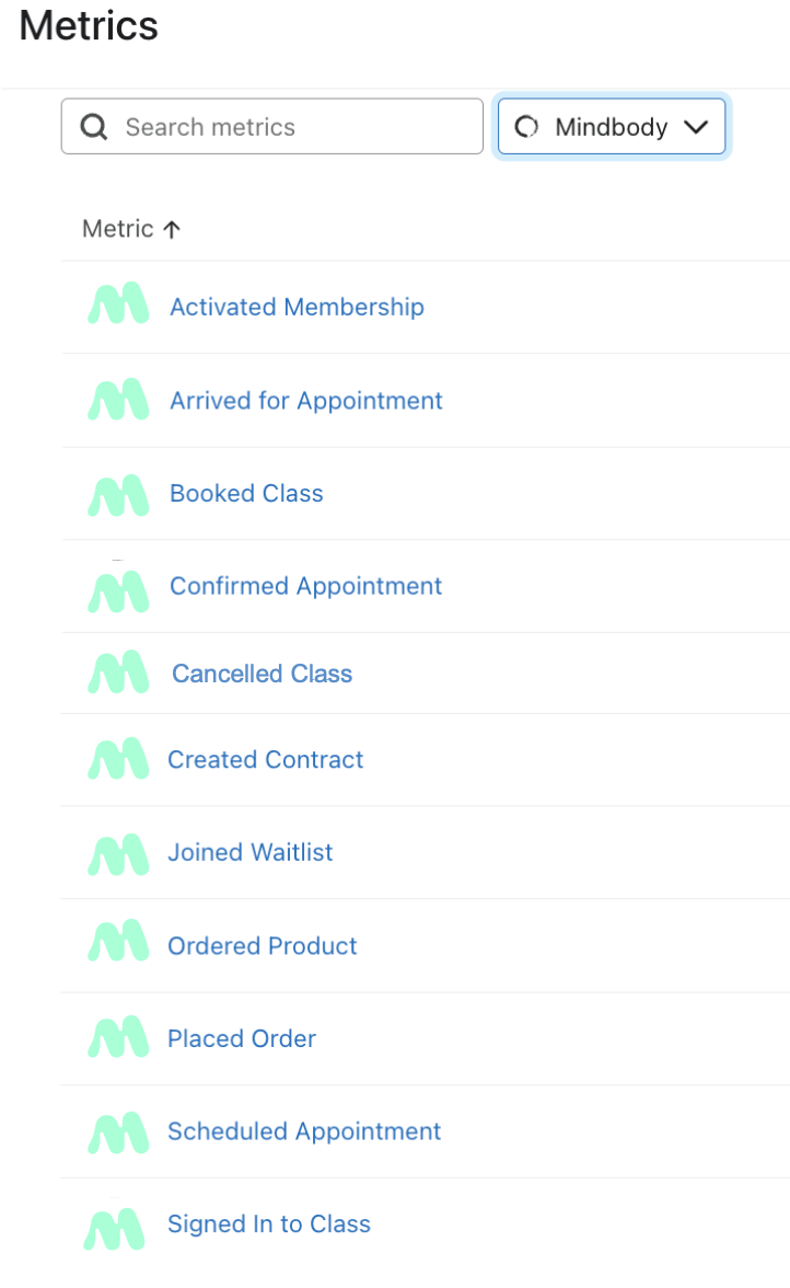 Ten en cuenta que sólo la métrica que utilices en Mindbody se sincronizará con Klaviyo, por lo que es posible que no veas toda la métrica que aparece arriba en tu cuenta.