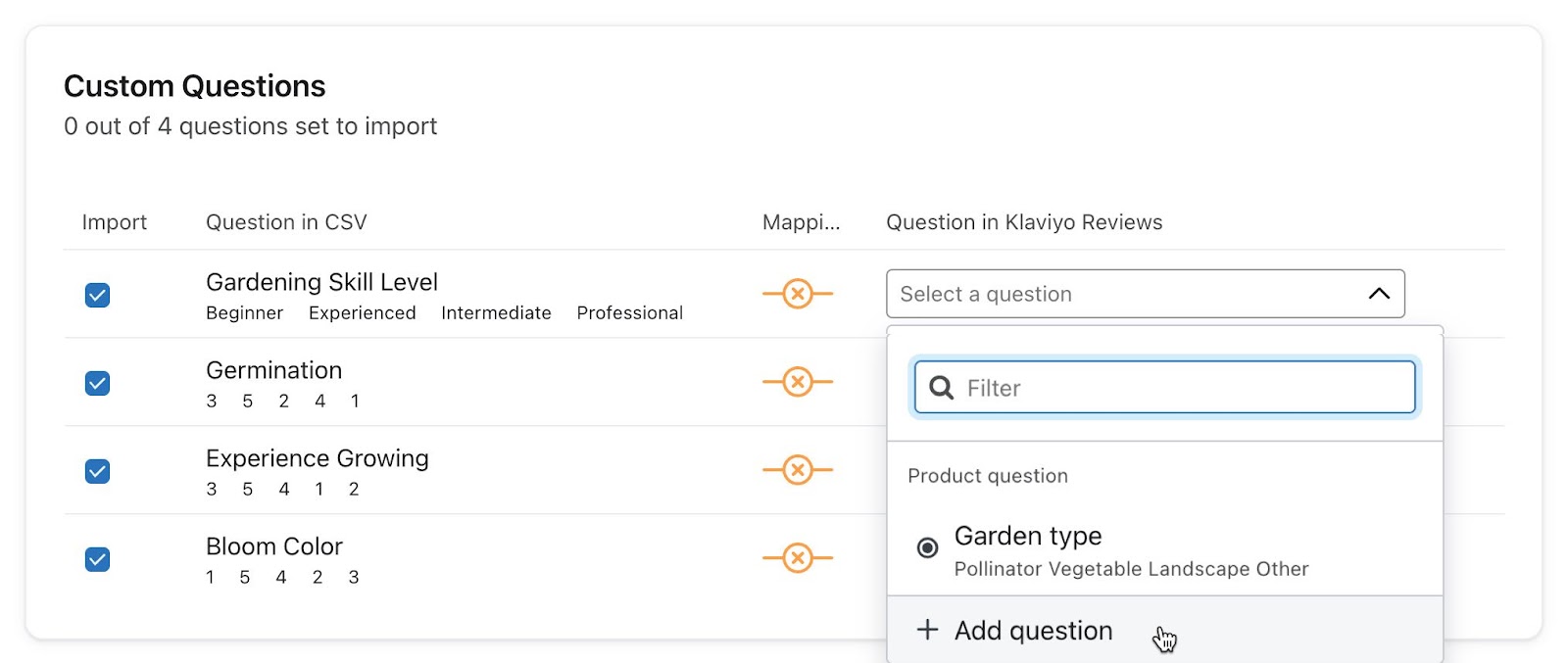 Al subir tus reseñas, tendrás la oportunidad de configurar tus preguntas personalizadas en Klaviyo, si aún no se han configurado. Para importar preguntas personalizadas: