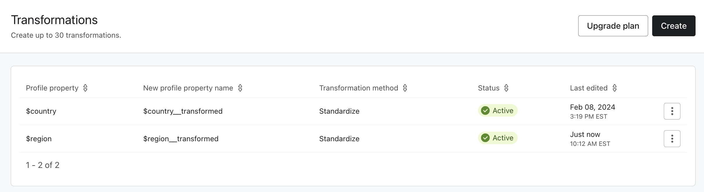 Una vez que tengas una transformación de datos creada en Klaviyo, la verás listada en la página de Transformaciones con los siguientes detalles:
