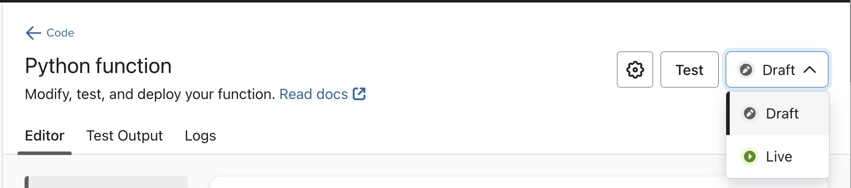 Para desplegar el código que escribas en el editor, cambia el desplegable de estado a En vivo.