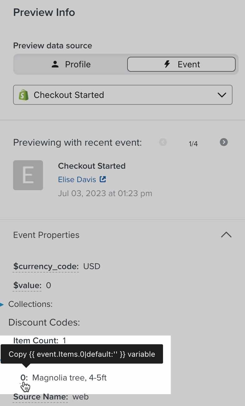 - Pasa el ratón por encima del nombre de la variable hasta que veas el mensaje Copiar variable {{ event.variable_name }} , y haz clic para copiarla.