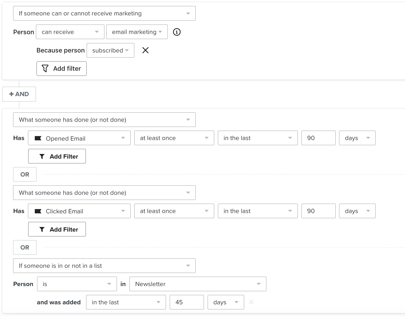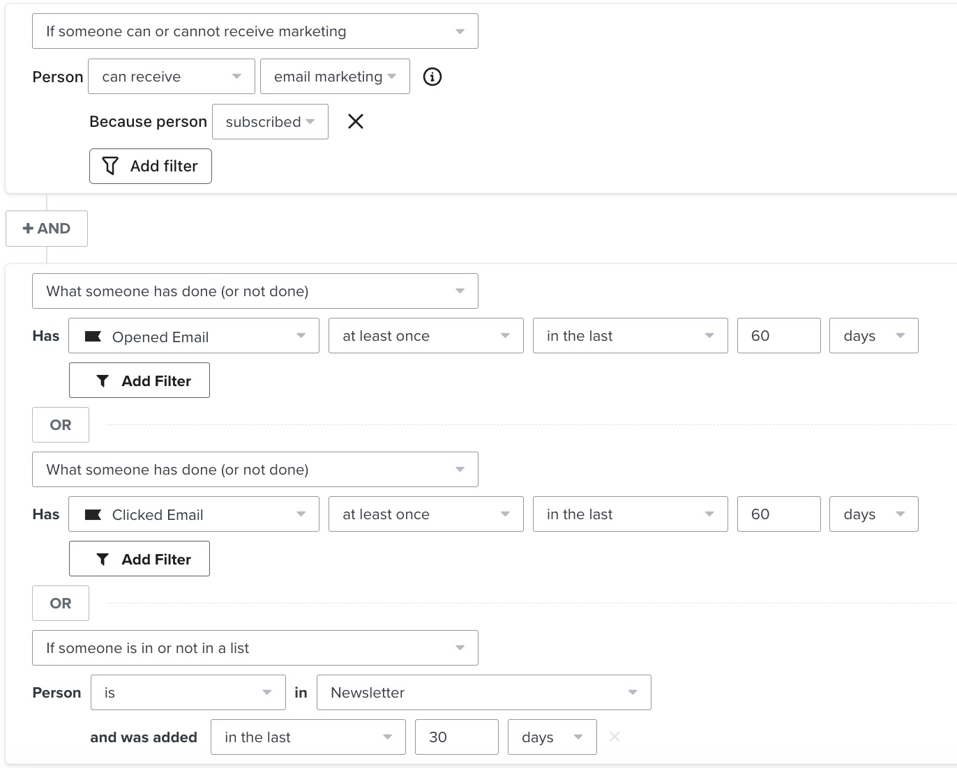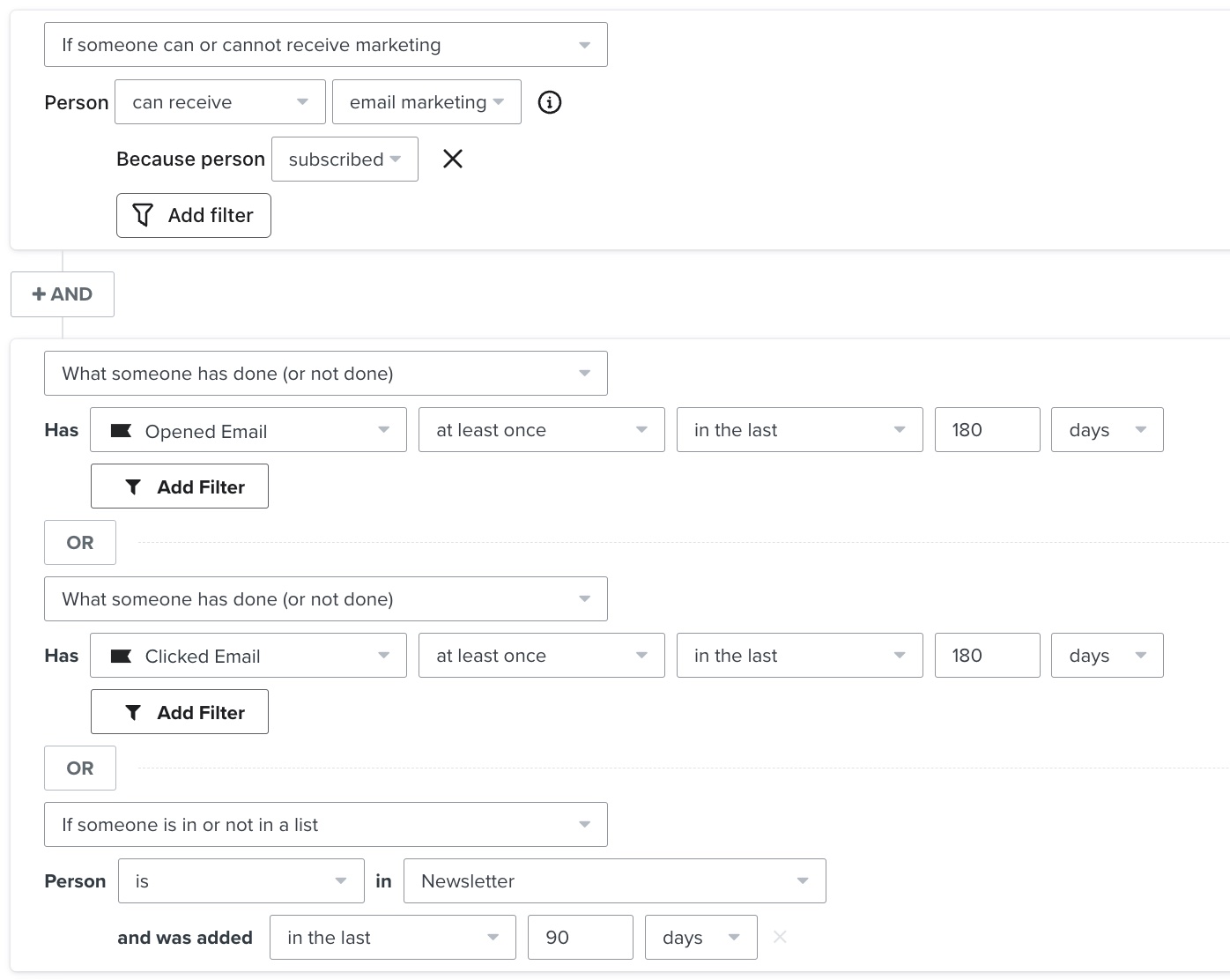 Crea un segmento basado en la interacción durante 30, 60, 90, 120 y 180 días. Los utilizarás cuando realices envíos a lo largo del tiempo, empezando por tu segmento de 30 días. Si envías a sin actividad suscriptor, te arriesgas a que tu correo electrónico sea movido a spam por el proveedor de correo (por ejemplo, Google, Hotmail, etc.).
