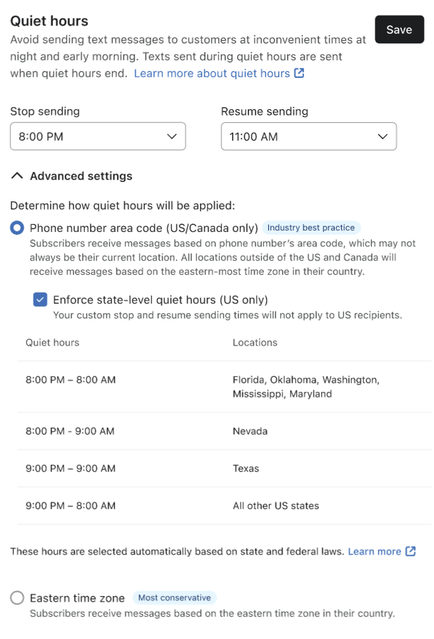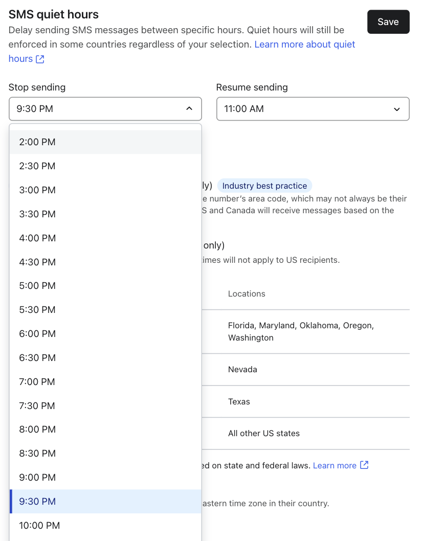 Las 2 horas representarán el intervalo en el que no se puede enviar un mensaje en la zona horaria utilizada. Por ejemplo, podrías ajustar tus horas de silencio para que no se pueda enviar un mensaje entre las 19:30 y las 11:30. Hora del Este en Estados Unidos y Canadá. - Haz clic en el desplegable situado debajo de Detener envío para cambiar cuándo deben comenzar las horas de silencio (es decir, a qué hora el flujo deja de enviar SMS).