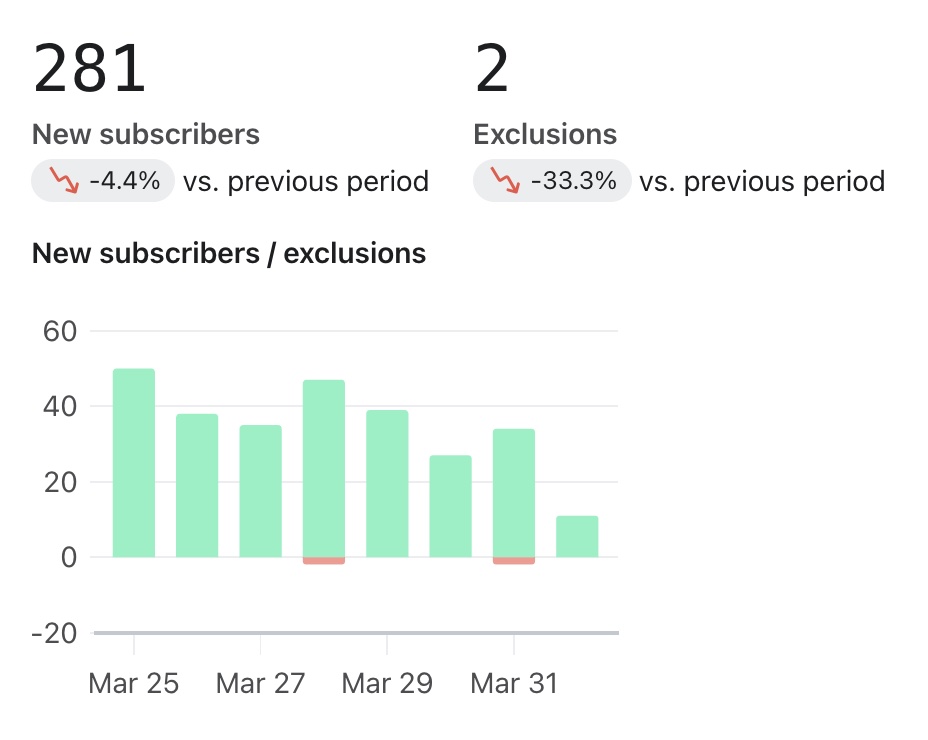 Si pasas el ratón por encima de cualquier punto del gráfico de líneas, también podrás ver el número total de suscriptores añadidos y excluidos en ese momento.