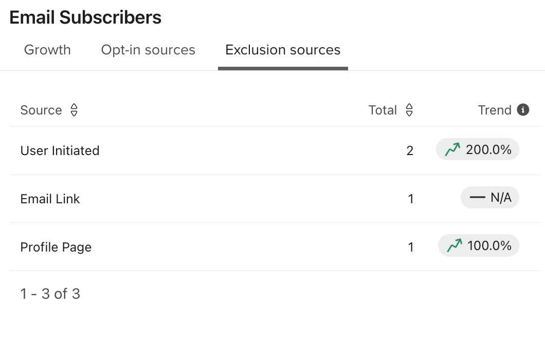 Ten en cuenta que puedes ver una discrepancia entre el recuento de nuevos suscriptores en la pestaña Crecimiento y el recuento de perfiles en la pestaña Fuentes de suscripción. Esto se debe a que si alguien cancela la suscripción en el mismo día después de suscribirse, no se tendrá en cuenta en el recuento de nuevos suscriptores.