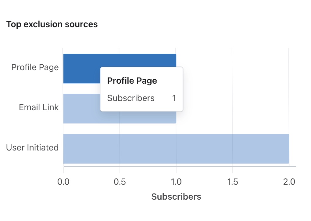Además, al pasar el ratón por encima de cualquiera de estas barras, puedes revisar el número total de suscriptores que se suprimieron a través de esa fuente específica.