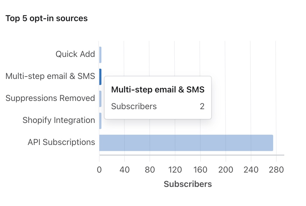 Además, al pasar el ratón sobre cualquiera de estas barras, puedes revisar el número total de suscriptores que se inscribieron a través de esa fuente específica.