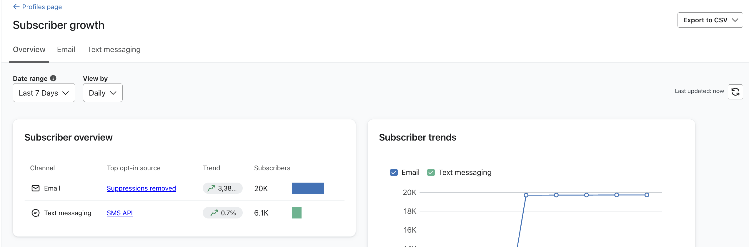 a. Exportar el crecimiento a lo largo del tiempo (esta descarga incluye todos los totales de suscriptores por canal, así como las altas y la supresión por canal específico).