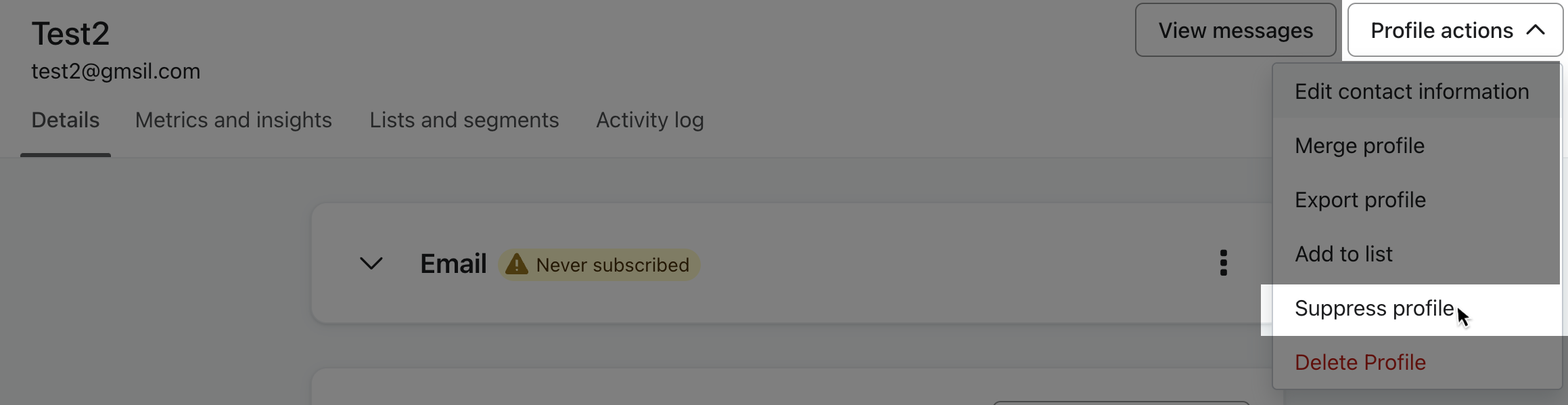 - Puedes eliminar manualmente la supresión de un perfil a través de su página de perfil o mediante una supresión masiva en Klaviyo. Ten en cuenta que eliminar una supresión manual no cambiará el estado del consentimiento de marketing por correo electrónico del perfil.