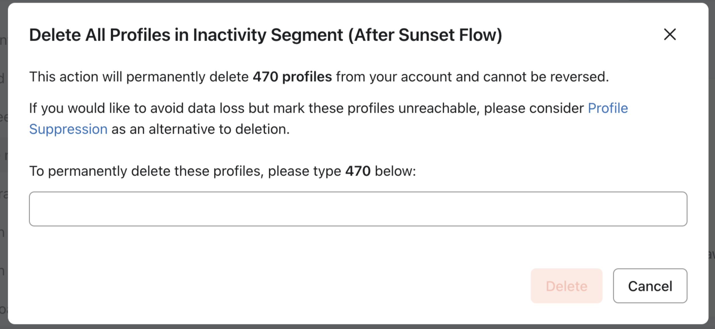 El resto de perfiles de tu cuenta no se modificarán y seguirán recibiendo correos electrónicos según su estado de consentimiento. Los perfiles suprimidos no son accesibles por correo electrónico y no contribuyen a tu plan de facturación de Klaviyo. Esta supresión se aplica aunque la persona haya dado su consentimiento e indicado que desea recibir correos electrónicos.