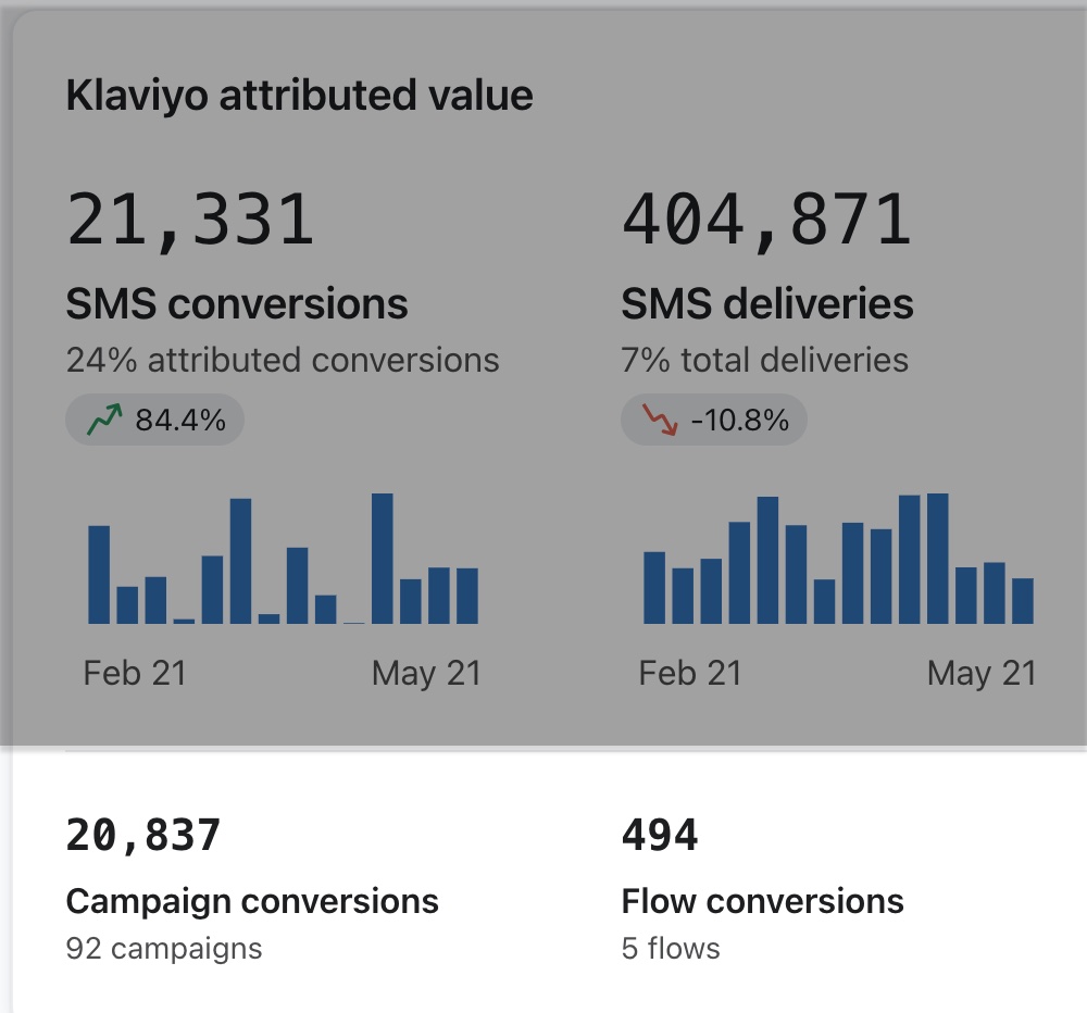 La tarjeta de valor atribuido a Klaviyo (KAV ) (valor atribuido a Klaviyo (KAV)) muestra los ingresos o la conversión atribuidos (según elijas ingresos o no ingresos métricos). Aquí puedes ver un desglose del éxito global de tu canal SMS en relación con los ingresos, la entrega, los ingresos por destinatarios y en un desglose de campañas frente a flujo.