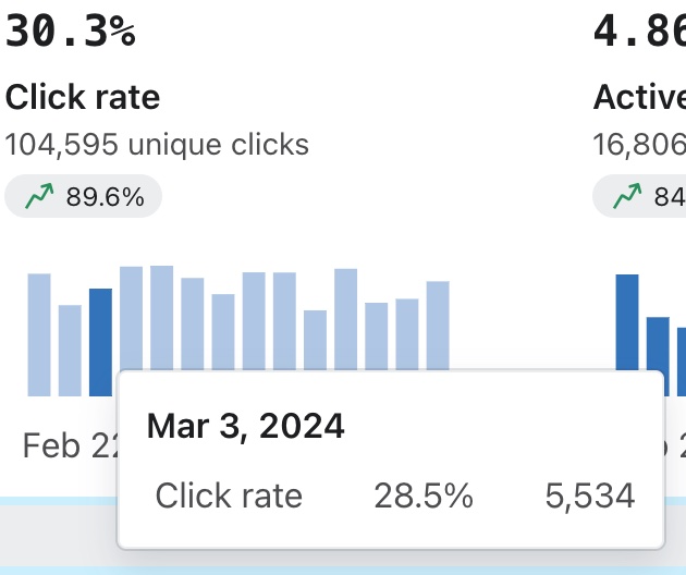 Haz clic para abrir la sección Rendimiento por para revisar la tarjeta métrica con más detalle por día, semana o mes (dependiendo de lo largo que sea tu periodo de tiempo). Puedes revisar cómo se alinean la entrega, los clics, tu conversión métrica y cancelar la suscripción con las cifras totales y los porcentajes que representan.