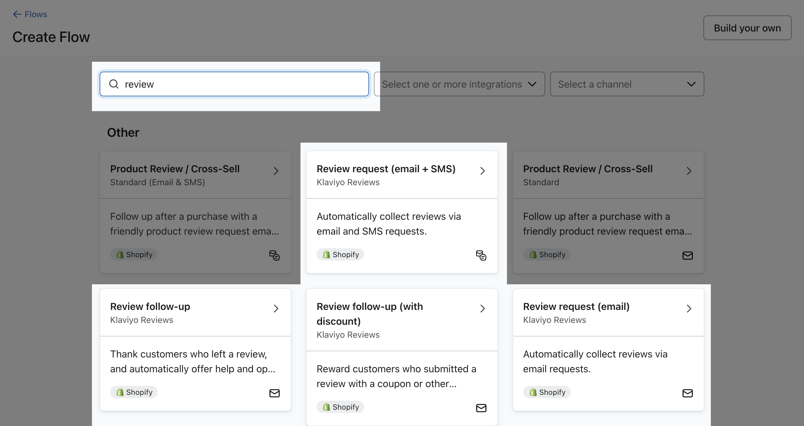 Puedes encontrar la plantilla de estos flujos navegando a flujo > Crear flujo y buscando Revisión en la Biblioteca de flujo. Todas las reseñas con la Klaviyo Reviews etiqueta utilizan Klaviyo Reviews métrica.