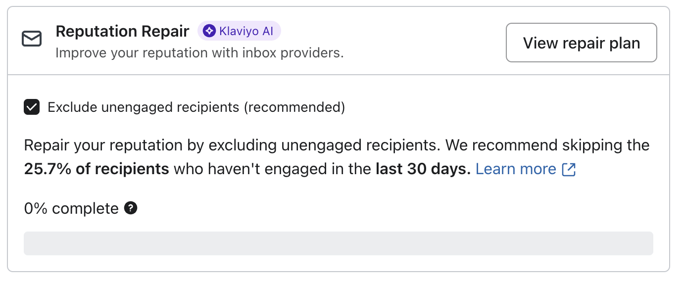 Infórmate sobre la IA de reparación de la Reputación y sobre cómo reunir los requisitos. La IA de reparación de reputación te ayuda a mejorar tu reputación de remitente y tu capacidad general de entrega excluyendo automáticamente de tus envíos a los sin interacciones perfil.