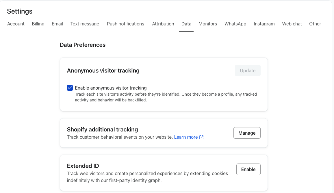 Al desactivar/inhabilitar uno o todos los identificadores ID ampliados, volverás inmediatamente a Klaviyo la configuración de seguimiento predeterminada de.