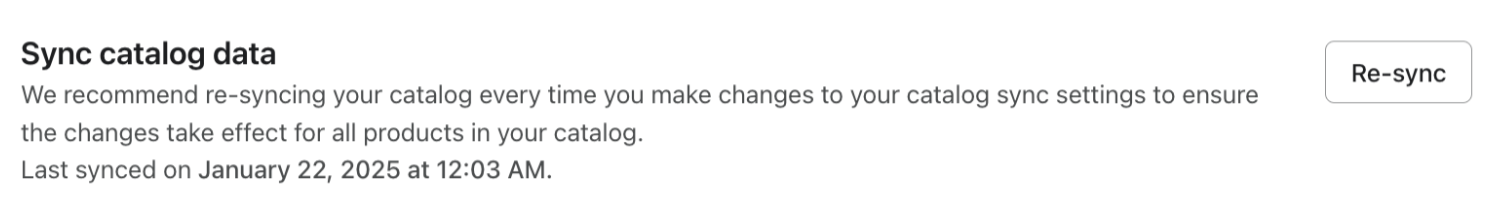 - En la sección Sincronizar datos del catálogo, haz clic en Volver a sincronizar. Tu catálogo comenzará a resincronizarse.