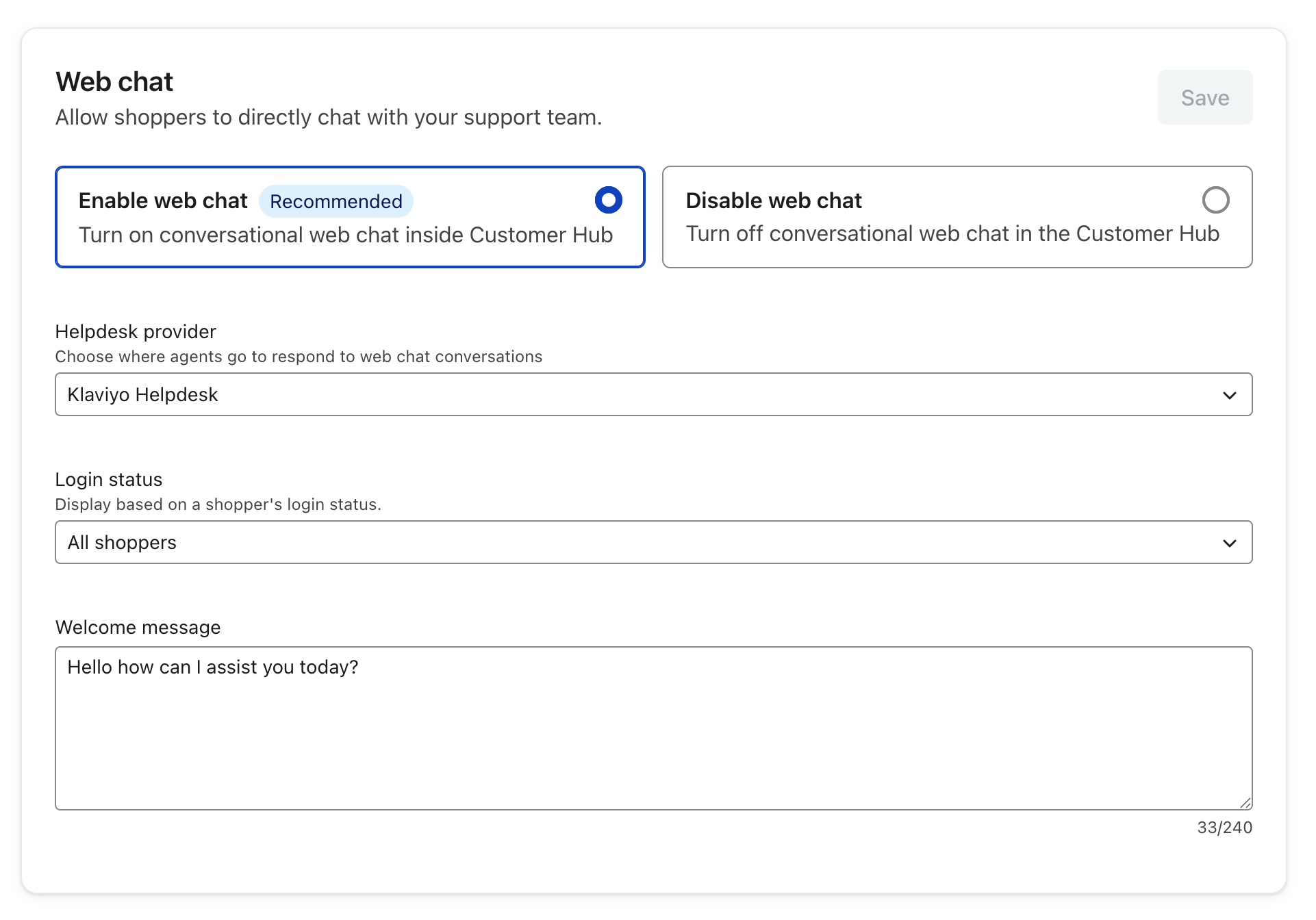 Esto te permite configurar rápidamente el chat para tu equipo de soporte (a través de Helpdesk) o el agente de servicio de IA sin necesidad de realizar configuraciones adicionales. Si decides utilizar Klaviyo Customer Hub más adelante, el chat web se integrará perfectamente con él.