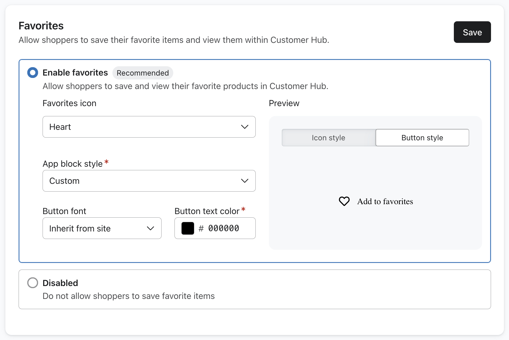 - Opcional: Para un estilo adicional, navega de nuevo a Klaviyo. Con el desplegable Estilo del bloque App, puedes personalizar el aspecto del botón de favoritos en las páginas de producto. Elige una de las dos opciones: