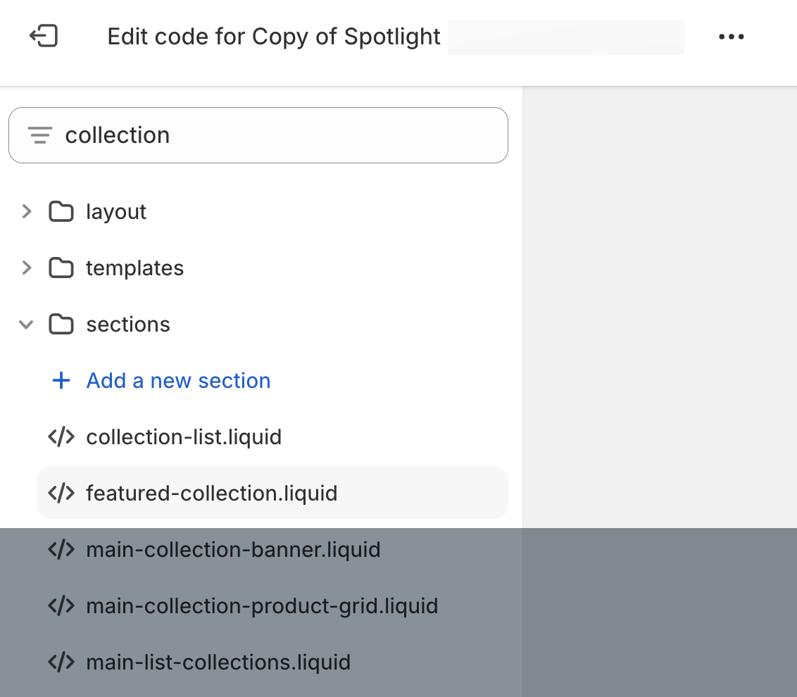 - En la barra lateral izquierda, busca y abre tu archivo de colecciones. Utilizaremos el archivo featured-collections.liquid para este ejemplo, aunque tu tema puede utilizar un archivo diferente.