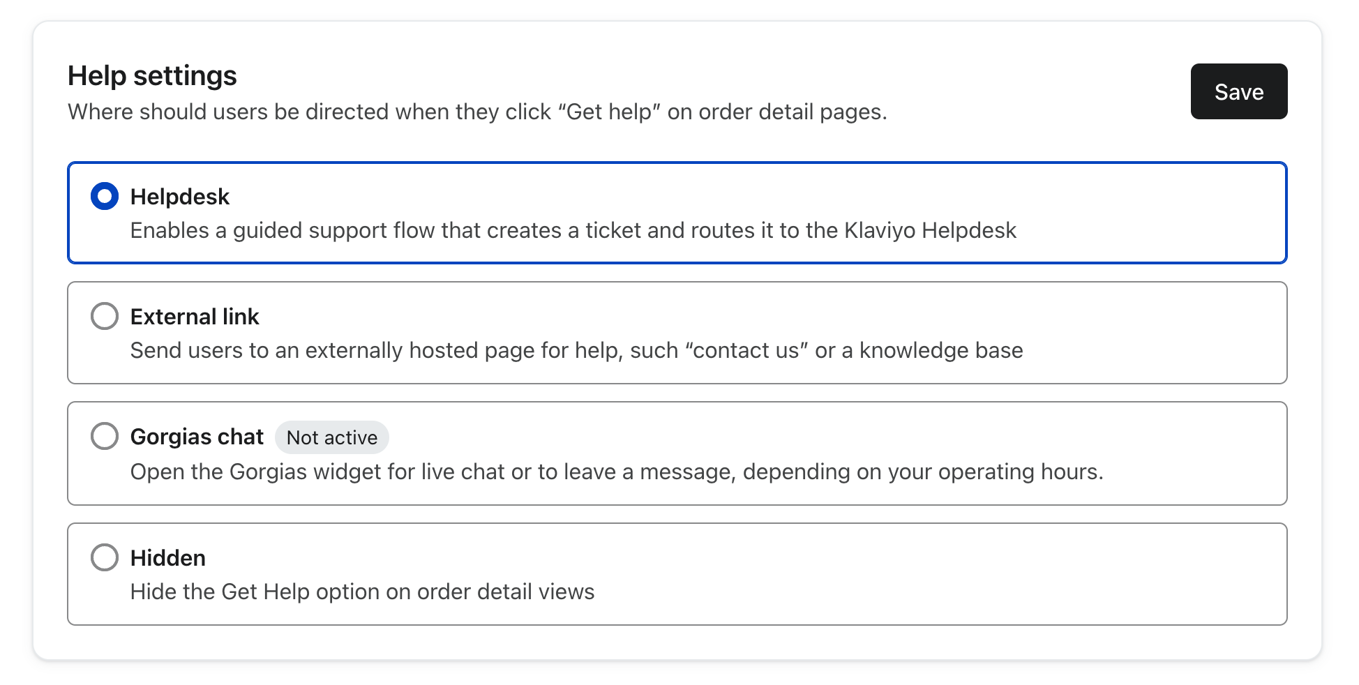 Consejo: Actualmente, Gorgias es la única plataforma cliente equipo de asistencia que puede integrarse directamente con Klaviyo Customer Hub. Si utilizas una plataforma de ayuda diferente, utiliza la opción de enlace externo para enviar al cliente a tus páginas de ayuda.