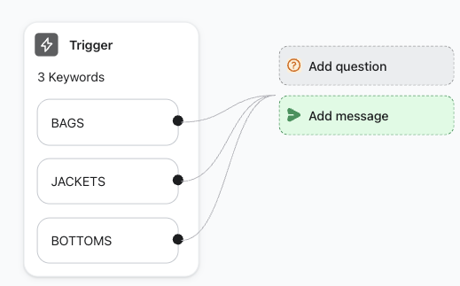 - Por ejemplo, agregar la misma pregunta o mensaje de todas las palabras clave: o un solo mensaje si alguien responde con "Bolsos" " Chaquetas" o "Pantalones"